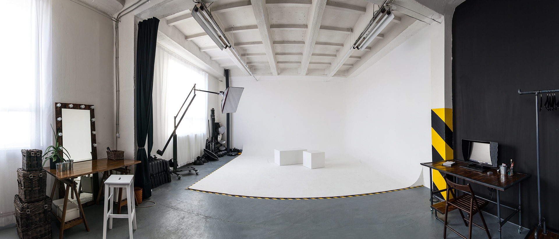 NEKONEČNÉ BIELE POZADIE (cyklorama) je rovnako dostupné na využitie v rámci zakladnej hodinovej sadzby (25€/h), avšak v prípade znečistenia pozadia (čierne šmuhy od topánok, otlačený make up a pod.) je poplatok 20-65€, ktorý pokrýva náklady spojené s maľovaním. Ak by došlo k poškodeniu pozadia, výška poplatku sa vypočíta podľa rozsahu škody a prác spojených s opravou. Pozadie je pravidelne udržiavane a maľované, ale ak si prajete mať čerstvo vymaľované, tak to vieme zabezpečiť za vyššie spomenutý poplatok 65€.
